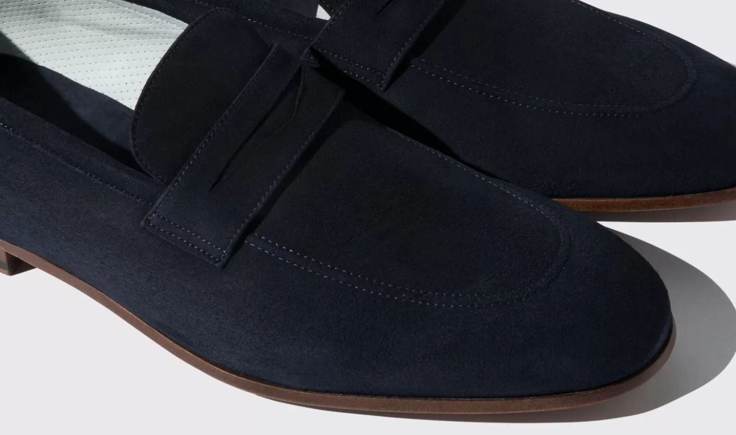 Our ‘Marzio Abisso Scamosciato’ Penny Loafers From Our Flexible Sole Family Are Handcrafted On An Italian Shoe Last By Skilled Artisans In Our Manufactory In Italy. These Shoes Are Crafted From Dark Blue Suede Leather And Have A Lining Made Of Perforated Leather Which Makes The Shoes Very Comfortable To Wear And Provides Improved Natural Breathability Of The Leather. These Shoes, Which Are Stitched In The Blake Welt Method, Have A Single Leather Sole Made Of Soft Greased Leather Which Makes Them Extremely Flexible And Provides Exceptional Comfort, Perfect For The Summer.
